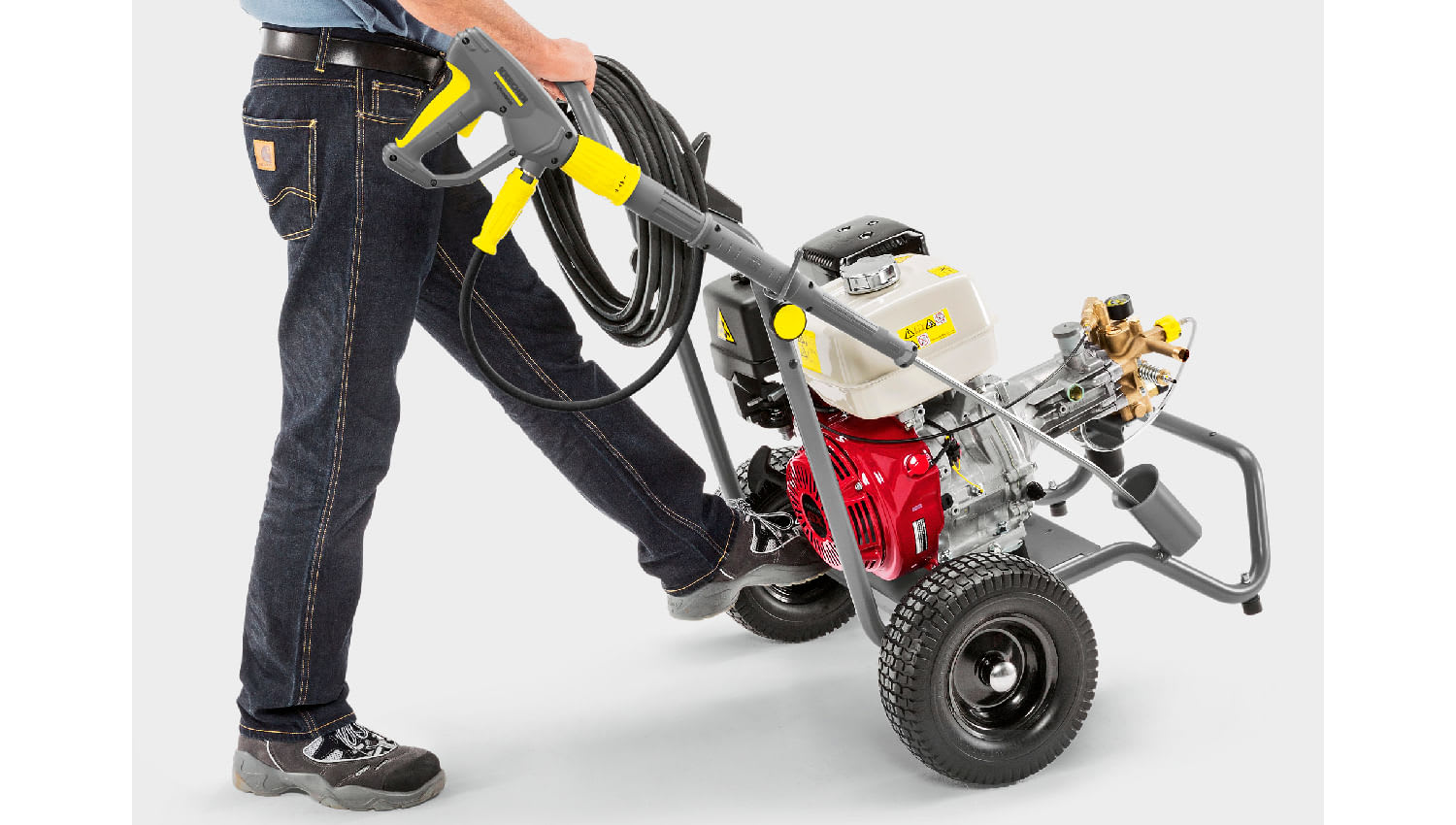 Operación sin red con un volumen de agua de 600 l/h. La nueva HD 6/15 G con un potente motor de combustión funciona sin electricidad y por lo tanto está diseñada para aplicaciones flexibles en la industria, la construcción y la agricultura. La hidrolavadora de alta presión tiene una robusta bomba de cigüeñal e impresiona por su facilidad de servicio y su excepcional movilidad. Extremadamente práctico: el sofisticado concepto de accesorios, en cada detalle.